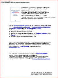 This report is from a study of the federal government's capacity to recruit highly qualified individuals for the top science and technology (S&T)-related leadership positions in the executive branch. The effort was supported by the Carnegie Commission on Science, Technology, and Government and by the National Research Council Fund of the Academies—National Academy of Sciences, National Academy of Engineering, and Institute of Medicine. It was carried out by a panel of the Academies' Committee on Science, Engineering, and Public Policy. The panel was well suited for the task. It was composed of distinguished former presidential appointees who have worked in or interacted with key S&T- related positions, and experts in the presidential appointment process (Appendix A provides brief information on panel members). Among them, the panel members have had many years of experience as presidential appointees in the White House, Executive Office of the President, the Departments of State, Defense (including the Air Force and Navy), Transportation, Health and Human Services, and Energy, and in the National Aeronautics and Space Administration.